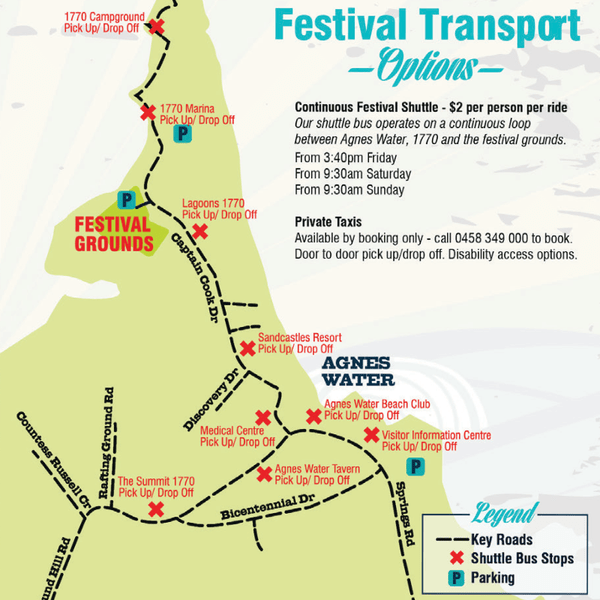 - Shuttle Buses are available to festival goers (for $2 per person – one way trip) and have different pick up points in both Agnes Water & 1770 (see map below).